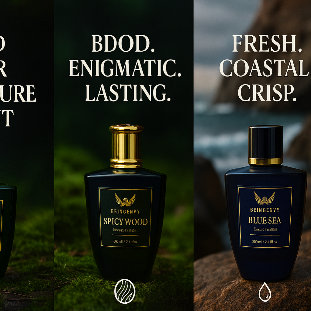 Crafted to express your unique aura, each BEINGENVY fragrance blends elegance with lasting impact. From bold woody notes to fresh coastal tones and warm musky depths — wear the mood, define your presence.